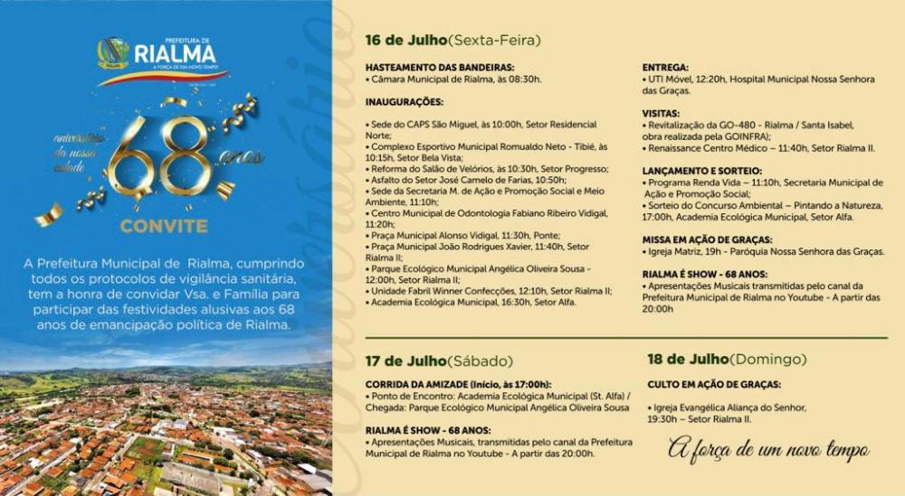 Prefeitura Municipal de Rialma, respeitando todos os protocolos sanitários contra a pandemia da Covid19, tem a honra de convidar Vossa Excelência, para a cerimônia de festividades alusivas ao aniversário de 68 anos de emancipação política de Rialma, a acorrer entre os dias 16 e 18 de julho de 2021, conforme cronograma anexo.