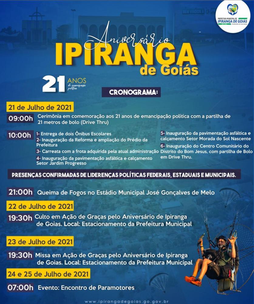 A Prefeitura Municipal de Ipiranga de Goiás, Dentro das normas de segurança e respeitando todos os protocolos sanitários contra a pandemia da Covid19, tem a honra de convidar todos ipiranguenses e Vossa Excelência, para a cerimônia de festividades alusivas ao 21 aniversário de emancipação política do Município de Ipiranga de Goiás, a acorrer entre os dias 21 e 25 de julho de 2021.