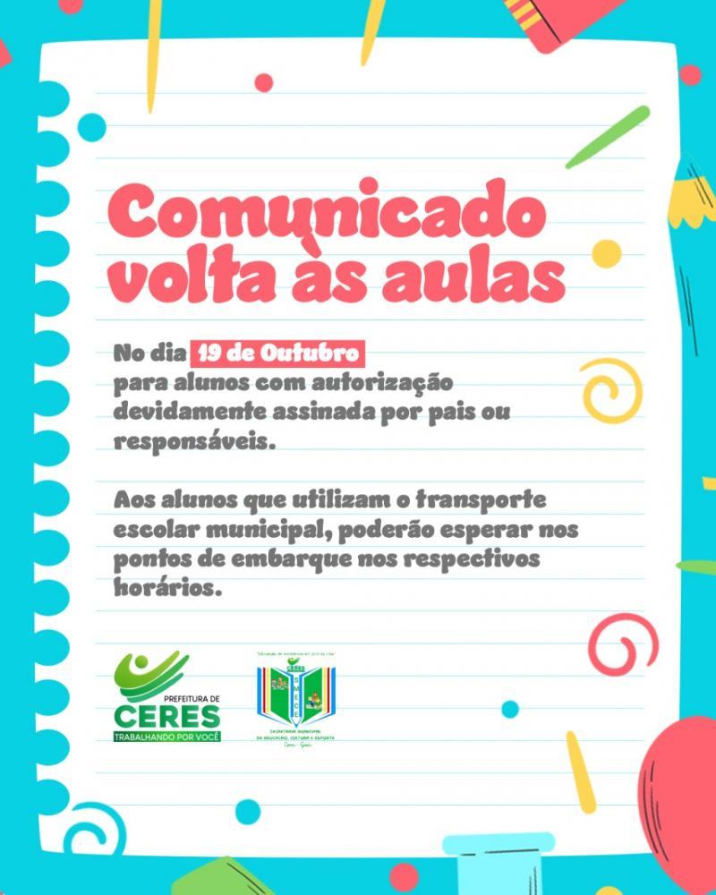 A Secretaria Municipal de Educação, Cultura e Esportes de Ceres, comunica aos pais e responsáveis, o retorno às aulas presenciais no dia 19 de outubro.