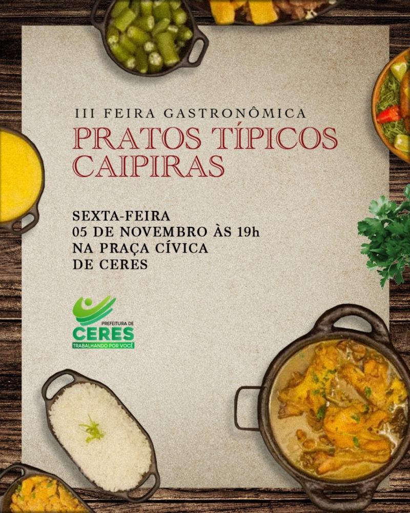 A Prefeitura Municipal de Ceres, por meio da Gerência de Desenvolvimento Rural, convida a todos para participarem da III Edição da Feira Gastronômica, que acontecerá no próximo dia 05 de novembro, sexta-feira, às 19h, na Praça Cívica. Não percam!