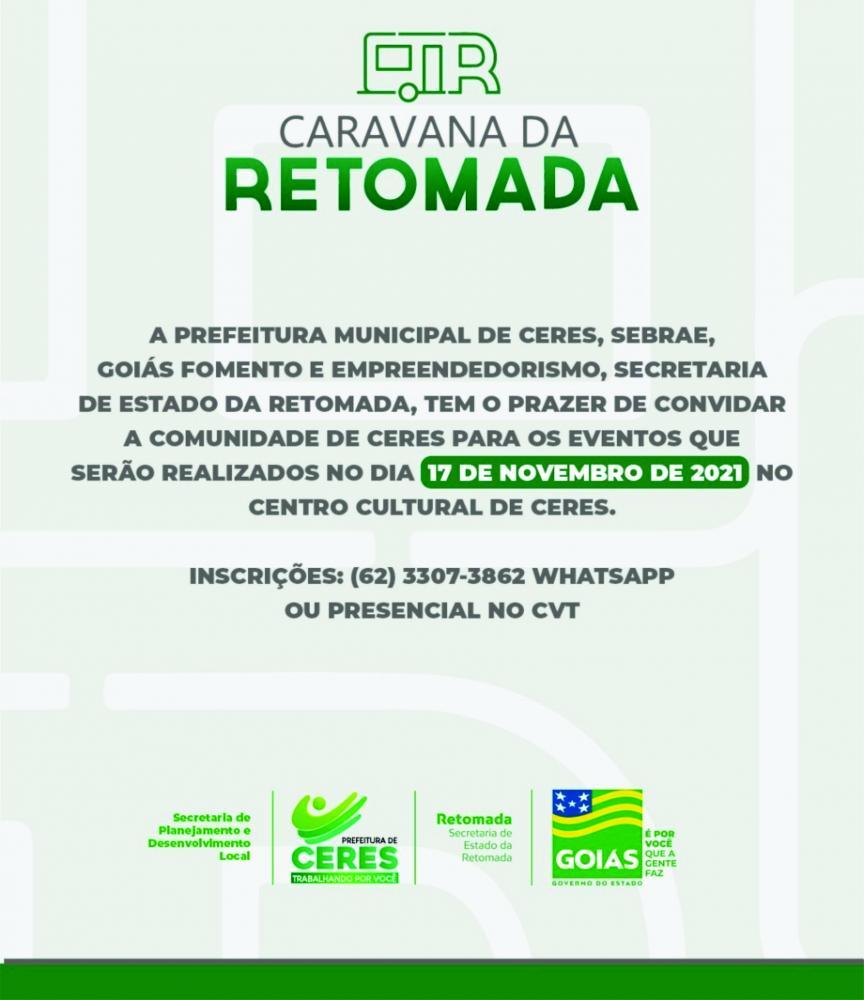Com o propósito de expandir o desenvolvimento econômico e social no município, Ceres receberá no dia 17 de novembro, quarta-feira, a Caravana da Retomada, do Governo do Estado, e a Prefeitura de Ceres tem o prazer de convidar toda a comunidade para participar das programações e atividades oferecidas.