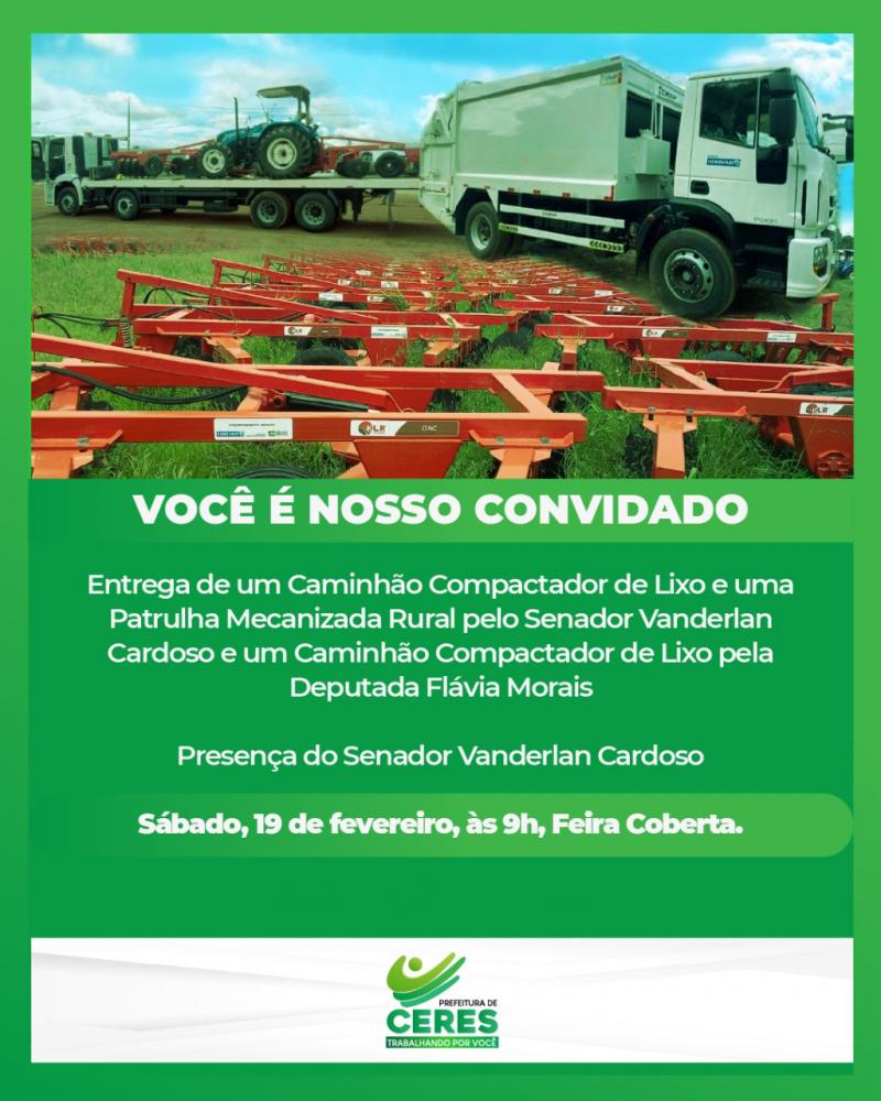 "A Prefeitura de Ceres tem o prazer de lhe convidar para a entrega de um CAMINHÃO COMPACTADOR DE LIXO e de "UMA PATRULHA MECANIZADA RURAL" destinados ao nosso município pelo SENADOR VANDERLAN CARDOSO, e um "CAMINHÃO COMPACTADOR DE LIXO" destinado pela DEPUTADA FLÁVIA MORAIS.
