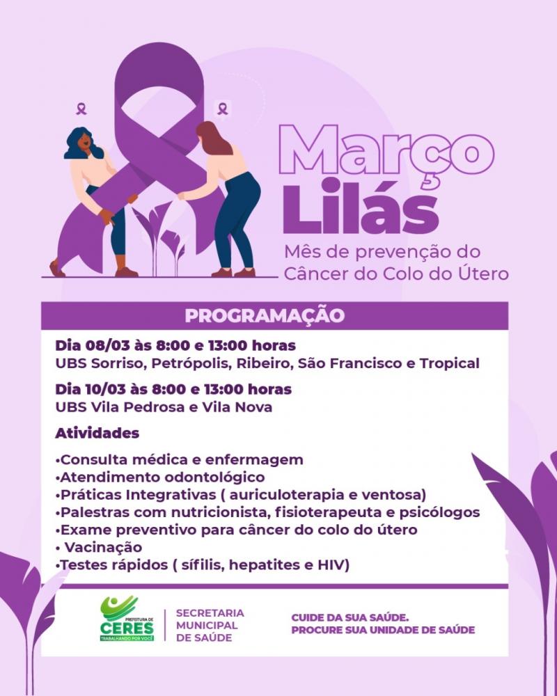 CampanhaCeres - Março Lilas. Além de celebrar no dia 8, o Dia Internacional da Mulher, o mês de março é dedicado a conscientização das mulheres sobre a prevenção do câncer do colo do útero. Durante este mês, nossas Unidades Básicas de Saúde estão com programação especial para o cuidado com a saúde da mulher.