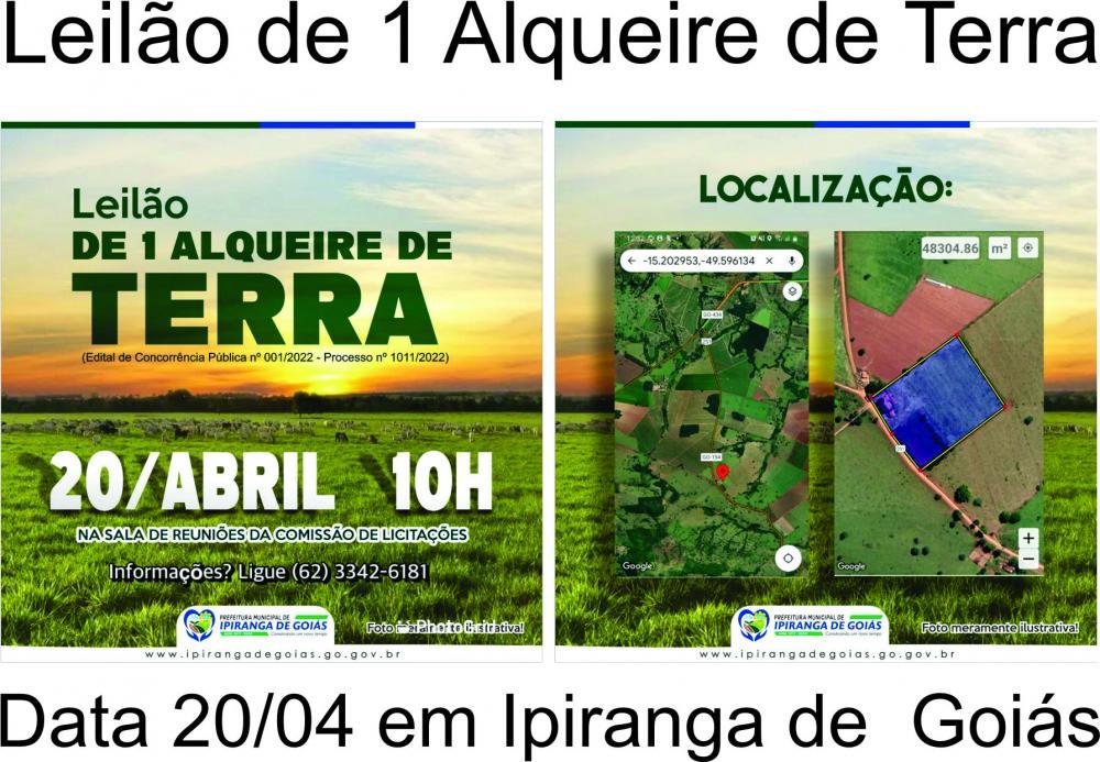 A Prefeitura Municipal de Ipiranga de Goiás irá realizar no dia 20/04 um leilão de 1 alqueire de terra.