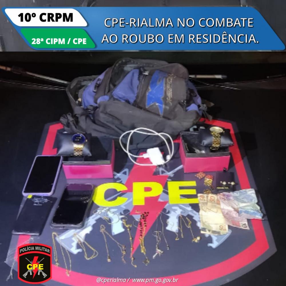 Equipe CPE 90 (07/04), após tomar ciência de um roubo a residência em andamento nas proximidades do Centro Cultural na cidade de Ceres, intensificou o patrulhamento nas proximidades do local, momento em que avistou dois indivíduos cujas características se assemelhavam as passadas a equipe pelas vítimas do crime. Ao proceder à abordagem, os suspeitos esboçaram reação e empreenderam fuga. Foi realizado o acompanhamento e efetuada a prisão dos mesmos. Os objetos, produtos do roubo, foram recuperados e juntamente com os autores foram apresentados na DP de Ceres para os procedimentos legais.