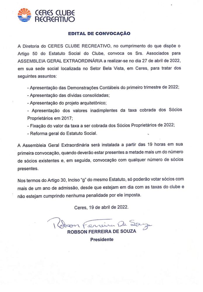 Tweet Edital do Ceres Clube Recreativo Comunicado NOTÍCIAS RELACIONADAS Palestra especial com Dra. Luciana Darrot, trazendo conhecimento e motivação para mulheres que desejam empreender, crescer e transformar suas realidades. Prefeitura de Rialma informa: Evento Mulher EmpreendedoraUm momento especial de inspiração,... Convite para a 1ª Feira do Agronegócio do Vale do São Patrício Convite para a 1ª Feira do Agronegócio do Vale do São Patrício O secretário de... Câmara Municipal de Ceres realiza a 1ª Sessão Ordinária do mês de março de 2026 Câmara Municipal de Ceres realiza a 1ª Sessão Ordinária do mês de março de... Ceres promove capacitação sobre cuidados com o pé diabético e recebe R$ 10 mil para fortalecer Atenção Básica Ceres promove capacitação sobre cuidados com o pé diabético e recebe R$ 10 mil para... Mais lidas ComunicadoComunicadoCidadaniaJustiçaMeio Ambiente Comunicado Rianápolis celebra o encerramento da 9ª Copa... Comunicado Ceres - Goiás informa: 24 Edital de Convocação Comunicado 6º EDITAL DE CONVOCAÇÃO – PROCESSO SELETIVO... ConCHESP realiza a primeira reunião de 2026 e... Visita institucional fortalece a saúde de Ceres Aluguel Social com Vagas em Ceres