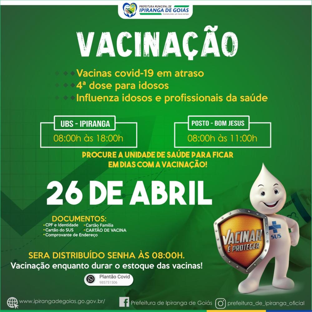 Tweet Ipiranga de Goiás - Vacinação Comunicado NOTÍCIAS RELACIONADAS Palestra especial com Dra. Luciana Darrot, trazendo conhecimento e motivação para mulheres que desejam empreender, crescer e transformar suas realidades. Prefeitura de Rialma informa: Evento Mulher EmpreendedoraUm momento especial de inspiração,... Convite para a 1ª Feira do Agronegócio do Vale do São Patrício Convite para a 1ª Feira do Agronegócio do Vale do São Patrício O secretário de... Câmara Municipal de Ceres realiza a 1ª Sessão Ordinária do mês de março de 2026 Câmara Municipal de Ceres realiza a 1ª Sessão Ordinária do mês de março de... Ceres promove capacitação sobre cuidados com o pé diabético e recebe R$ 10 mil para fortalecer Atenção Básica Ceres promove capacitação sobre cuidados com o pé diabético e recebe R$ 10 mil para... Mais lidas ComunicadoComunicadoCidadaniaJustiçaMeio Ambiente Comunicado Rianápolis celebra o encerramento da 9ª Copa... Comunicado Ceres - Goiás informa: 24 Edital de Convocação Comunicado 6º EDITAL DE CONVOCAÇÃO – PROCESSO SELETIVO... ConCHESP realiza a primeira reunião de 2026 e... Visita institucional fortalece a saúde de Ceres Aluguel Social com Vagas em Ceres