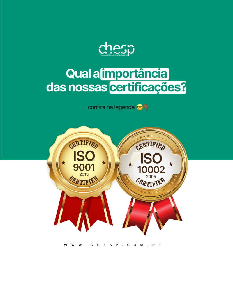 Você já conhece as certificações 9001 e 10002? A CHESP visa sempre melhorar seus processos. Dessa forma, certificou e implementou o Sistema de Gestão da Qualidade conforme as normas ISO 9001:2015 e 10002:2005, a fim de melhorar os processos de: