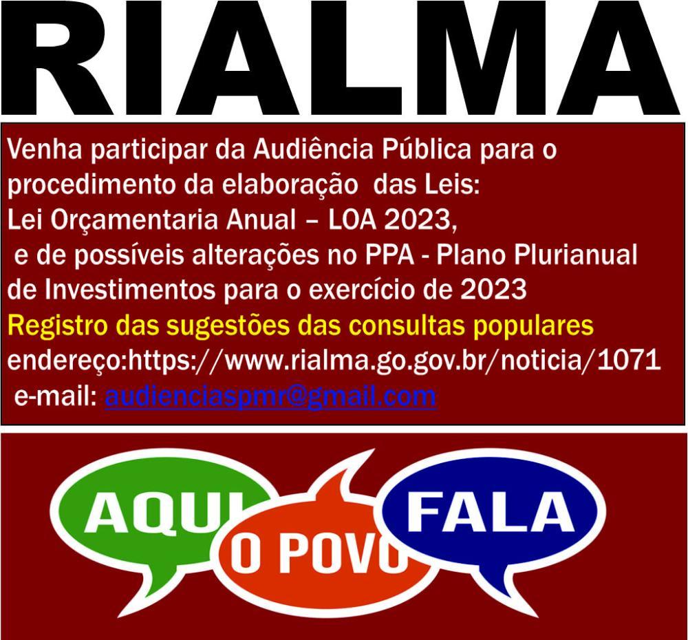 ComunicadoO Secretário Municipal de Administração de Rialma, vem CONVOCAR Audiência Pública para o procedimento da elaboração das Leis: Lei Orçamentaria Anual – LOA 2023, e de possíveis alterações no PPA - Plano Plurianual de Investimentos para o exercício de 2023 e, a acontecer entre os dias: 09 a 25 de agosto de 2022, onde sugestões serão coletadas por meio digital по seguinte endereço:https://www.rialma.go.gov.br/noticia/1071 também pelo e-mail: audienciaspmr@gmail.com, quando serão registradas as sugestões das consultas populares realizadas para compor os referidos projetos, ou participar de audiência presencial, a ocorrer no dia 25 de agosto de 2022, às 10.00 horas, na Escola Municipal de Gestão (Auditório da Prefeitura Municipal de Rialma).