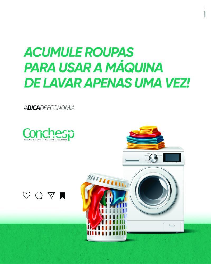 Sabemos que a máquina de lavar é uma ajuda e tanto quando se trata de lavar roupas, mas apesar de toda a ajuda, ela pode aumentar um pouco a sua fatura de energia. Por isso, a nossa dica de economia hoje é evitar usar a sua máquina de lavar com pequenas quantidades de roupas. Opte sempre por acumular suas peças de roupas e utilizar a máquina uma única vez com a quantidade de roupas indicada pelo fabricante.