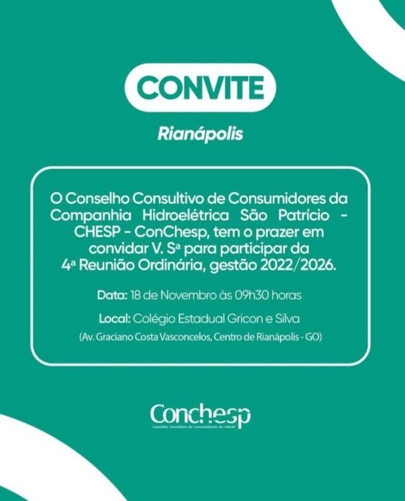 Tweet Reunião do ConChesp em Rianápolis Comunicado NOTÍCIAS RELACIONADAS Palestra especial com Dra. Luciana Darrot, trazendo conhecimento e motivação para mulheres que desejam empreender, crescer e transformar suas realidades. Prefeitura de Rialma informa: Evento Mulher EmpreendedoraUm momento especial de inspiração,... Convite para a 1ª Feira do Agronegócio do Vale do São Patrício Convite para a 1ª Feira do Agronegócio do Vale do São Patrício O secretário de... Câmara Municipal de Ceres realiza a 1ª Sessão Ordinária do mês de março de 2026 Câmara Municipal de Ceres realiza a 1ª Sessão Ordinária do mês de março de... Ceres promove capacitação sobre cuidados com o pé diabético e recebe R$ 10 mil para fortalecer Atenção Básica Ceres promove capacitação sobre cuidados com o pé diabético e recebe R$ 10 mil para... Mais lidas ComunicadoComunicadoCidadaniaJustiçaMeio Ambiente Comunicado Rianápolis celebra o encerramento da 9ª Copa... Comunicado Ceres - Goiás informa: 24 Edital de Convocação Comunicado 6º EDITAL DE CONVOCAÇÃO – PROCESSO SELETIVO... ConCHESP realiza a primeira reunião de 2026 e... Visita institucional fortalece a saúde de Ceres Aluguel Social com Vagas em Ceres