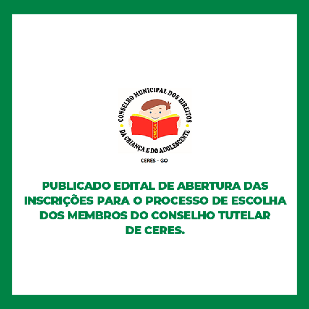 O Conselho Municipal dos Direitos da Criança e do Adolescente, vem a publico informar que o Edital de abertura para inscrições para o Processo de Escolha dos membros do Conselho Tutelar 2024/2028 está publicado. O prazo para inscrição é de 03 à 20 de abril na sede do Conselho dos Direitos da Criança e do Adolescente no prédio da Prefeitura Municipal de Ceres, nos dias úteis em horário de atendimento ao público.