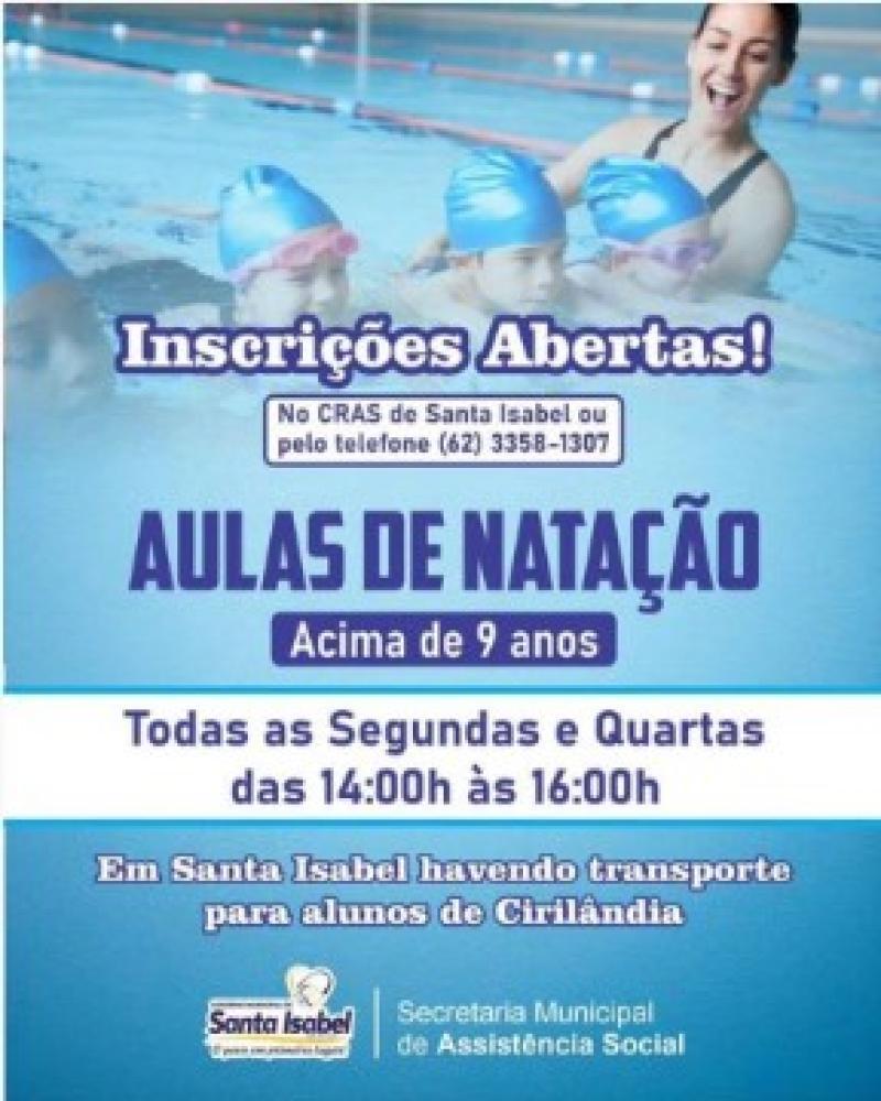 ComunicadoEstão abertas as inscrições para Crianças à partir de 9 anos para Aulas de Natação em Santa Isabel, havendo transporte para alunos de Cirilândia, todas as Segundas e Quartas das 14:00h às 16:00h.