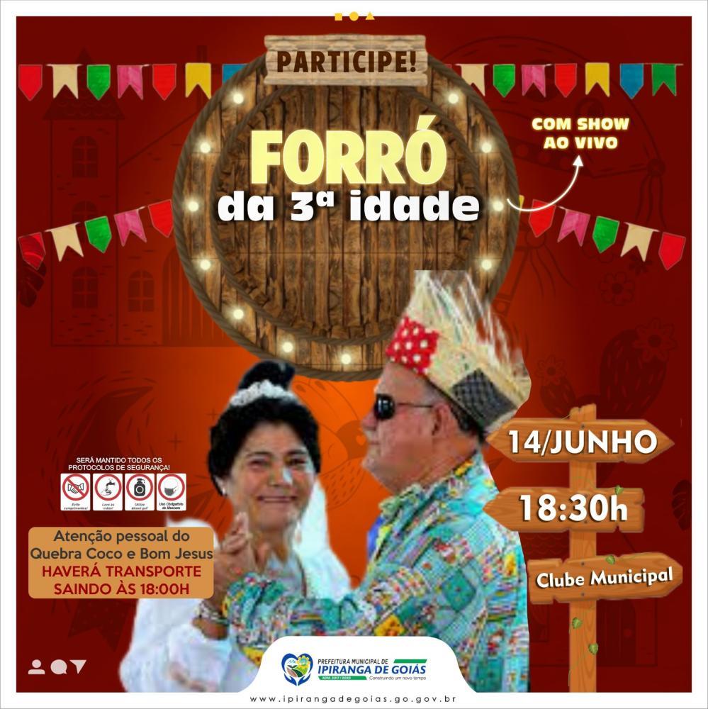 A Prefeitura de Ipiranga de Goiás por meio da Secretaria Municipal de Assistência Social promove no dia 14 de junho, no Clube Municipal o "Forro da Terceira Idade". O Forró tem como objetivo trazer bons momentos e muita diversão para os idosos de Ipiranga de Goiás, Bom Jesus e Quebra Côco e ainda idosos das cidades circunvizinhas.