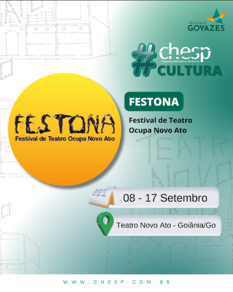 Este é mais um apoio cultural da CHESP por meio do Programa Estadual de Incentivo à Cultura – Goyazes, que consiste no financiamento de projetos por empresas privadas em troca da concessão do benefício fiscal do ICMS.