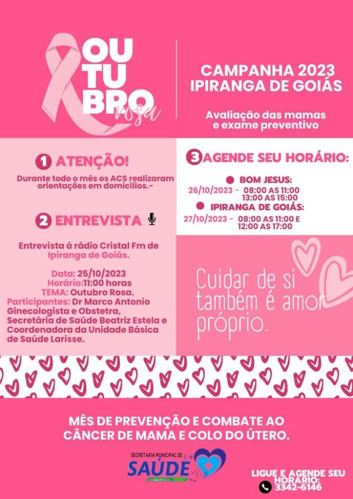 Tweet Ipiranga de Goiás - Saúde - Outubro Rosa Comunicado NOTÍCIAS RELACIONADAS Palestra especial com Dra. Luciana Darrot, trazendo conhecimento e motivação para mulheres que desejam empreender, crescer e transformar suas realidades. Prefeitura de Rialma informa: Evento Mulher EmpreendedoraUm momento especial de inspiração,... Convite para a 1ª Feira do Agronegócio do Vale do São Patrício Convite para a 1ª Feira do Agronegócio do Vale do São Patrício O secretário de... Câmara Municipal de Ceres realiza a 1ª Sessão Ordinária do mês de março de 2026 Câmara Municipal de Ceres realiza a 1ª Sessão Ordinária do mês de março de... Ceres promove capacitação sobre cuidados com o pé diabético e recebe R$ 10 mil para fortalecer Atenção Básica Ceres promove capacitação sobre cuidados com o pé diabético e recebe R$ 10 mil para... Mais lidas ComunicadoComunicadoCidadaniaJustiçaEsporte Comunicado VOCÊ TEM UMA IDEIA… MAS ELA AINDA NÃO VIROU... Cidadania Semi Final da 9ª Copa Regional de Futsal de... Comunicado Rianápolis celebra o encerramento da 9ª Copa... 6º EDITAL DE CONVOCAÇÃO – PROCESSO SELETIVO... ConCHESP realiza a primeira reunião de 2026 e... 1ª SESSÃO ORDINÁRIA DA CÂMARA MUNICIPAL DE...