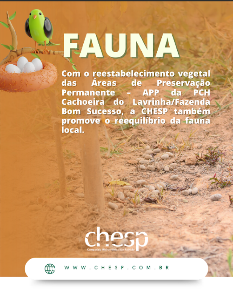 Pensando nisso, o PRAD desenvolvido pela CHESP na PCH- São Patrício busca o reequilíbrio da fauna local.
