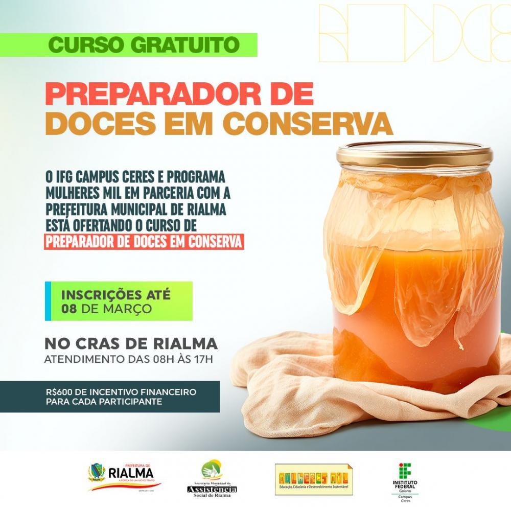 A Prefeitura de Rialma, por meio da Secretaria de Assistência Social em parceria com IFG Campus Ceres, abriu inscrições para curso preparador de doces em conserva.