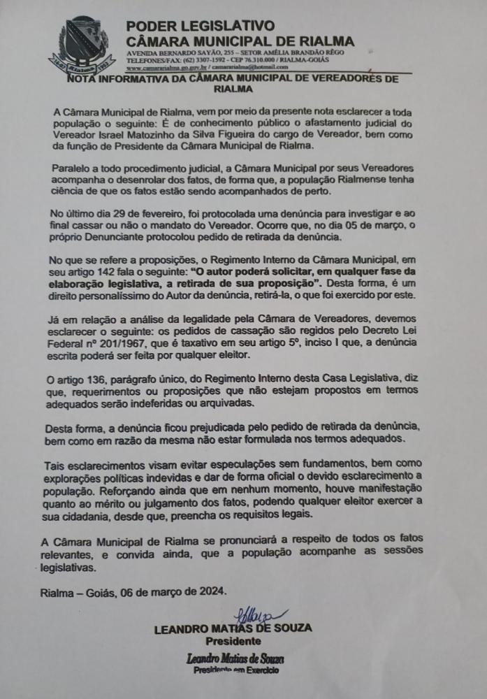 ComunicadoNesta quarta-feira (06), a Câmara Municipal de Rialma por meio de seu Presidente Leandro Matias de Souza, emitiu uma nota informativa a toda comunidade Rialmense. Na nota trás informações sobre o andamento do afastamento judicial do Vereador Matozinho da Silva Figueira do cargo de Vereador, bem como da função de Presidente da Câmara Municipal de Rialma.