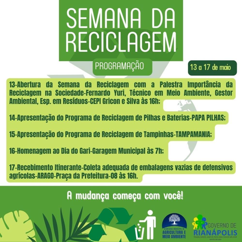 Tweet Rianápolis - Semana da Reciclagem Comunicado NOTÍCIAS RELACIONADAS Aqui a sua voz é ouvida! CONCHESP INFORMA: Aqui a sua voz é ouvida!O Conchesp atua como um verdadeiro aliado do consumidor de... Mais de 25 toneladas de pneus inservíveis tiveram a destinação correta! Prefeitura de Rianápolis informa: Mais de 25 toneladas de pneus inservíveis tiveram a... Cronograma da Coleta de Limpeza Urbana Prefeitura de Rialma informa: Cronograma da Coleta de Limpeza UrbanaA Prefeitura de Rialma informa que a coleta de... Bandeira verde em março CHESP informa: Bandeira verde em março A ANEEL anunciou que a bandeira tarifária para este... Mais lidas ComunicadoComunicadoCidadaniaJustiçaEsporte Comunicado VOCÊ TEM UMA IDEIA… MAS ELA AINDA NÃO VIROU... Cidadania Semi Final da 9ª Copa Regional de Futsal de... Comunicado Rianápolis celebra o encerramento da 9ª Copa... 6º EDITAL DE CONVOCAÇÃO – PROCESSO SELETIVO... ConCHESP realiza a primeira reunião de 2026 e... Ceres - Goiás informa: 24 Edital de Convocação