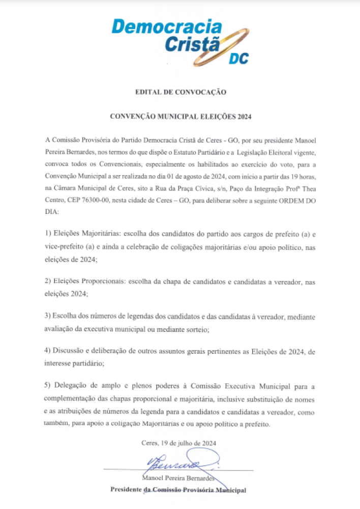 Tweet Edital de Convocação - Eleições 2024 Comunicado NOTÍCIAS RELACIONADAS Câmara de Ceres informa! 8 de Março, Dia Internacional da Mulher Aqui a sua voz é ouvida! CONCHESP INFORMA: Aqui a sua voz é ouvida!O Conchesp atua como um verdadeiro aliado do consumidor de... Mais de 25 toneladas de pneus inservíveis tiveram a destinação correta! Prefeitura de Rianápolis informa: Mais de 25 toneladas de pneus inservíveis tiveram a... Mais lidas ComunicadoComunicadoCidadaniaJustiçaMeio Ambiente Comunicado Rianápolis celebra o encerramento da 9ª Copa... Comunicado Ceres - Goiás informa: 24 Edital de Convocação Comunicado 6º EDITAL DE CONVOCAÇÃO – PROCESSO SELETIVO... Aluguel Social com Vagas em Ceres Edital de abertura do processo eleitoral,... Lei federal de sustentabilidade financeira dos...
