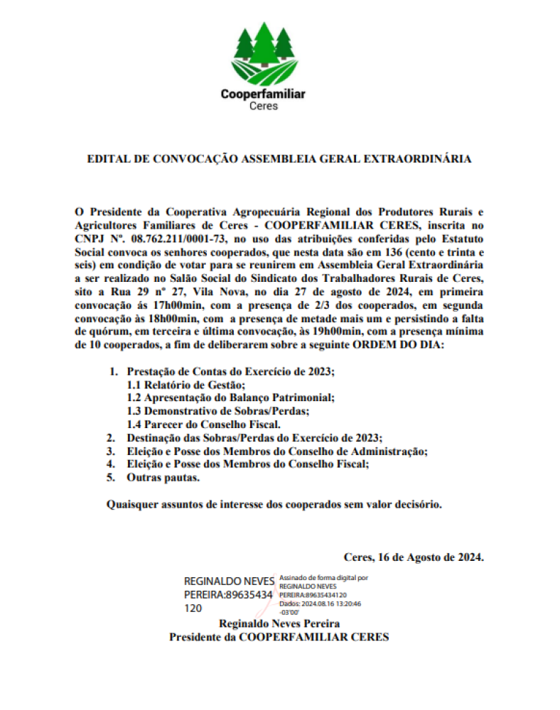 Tweet EDITAL DE CONVOCAÇÃO Edital NOTÍCIAS RELACIONADAS EDITAL DE CONVOCAÇÃO da Cooperativa dos Amigos da Reciclagem e Sustentabilidade Ambiental de Itapaci – Goiás e Centro Oeste Goiano denominada “Planeta Verde” EDITAL DE CONVOCAÇÃO A Diretoria da Cooperativa dos Amigos da Reciclagem e Sustentabilidade... EDITAL DE CONVOCAÇÃO da Cooperativa dos Amigos da Reciclagem e Sustentabilidade Ambiental de Itapaci – Goiás e Centro Oeste Goiano EDITAL DE CONVOCAÇÃO A Diretoria da Cooperativa dos Amigos da Reciclagem e Sustentabilidade Ambiental... Edital de Convocação Edital de Convocação do Sindicato dos Trabalhadores Rurais Agricultores e Agricultoras de Ceres com extensão de base... Mais lidas ComunicadoComunicadoCidadaniaJustiçaEsporte Comunicado VOCÊ TEM UMA IDEIA… MAS ELA AINDA NÃO VIROU... Cidadania Semi Final da 9ª Copa Regional de Futsal de... Comunicado Rianápolis celebra o encerramento da 9ª Copa... 6º EDITAL DE CONVOCAÇÃO – PROCESSO SELETIVO... EDITAL DE CONVOCAÇÃO ConCHESP realiza a primeira reunião de 2026 e...