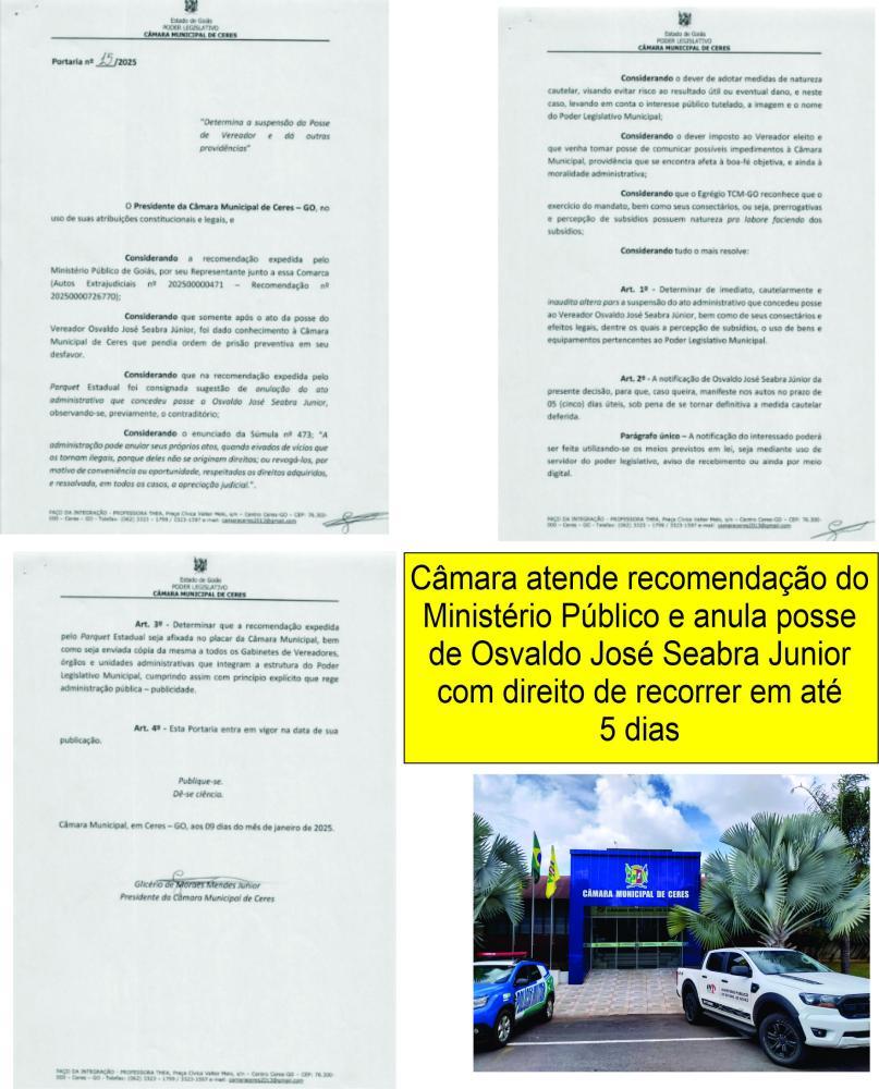 Nesta quinta-feira (09/janeiro/2025), após receber notificação do Ministério Público, a Câmara Municipal de Ceres, atende recomendação do Ministério Público e suspende ato administrativo que concedeu posse a Osvaldo José Seabra Junior, bem como seus direitos ao cargo de vereador; atende outras solicitações, informados todos os edis e funcionários sobre a suspensão do ato e ainda a fixação no placar da casa de Leis.