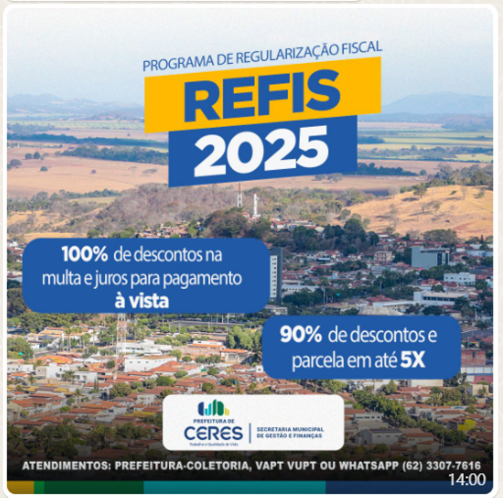Informamos que, a partir do dia 20 de março, terá início o REFIS 2025, um programa de recuperação fiscal que oferece condições facilitadas para o pagamento de dívidas com o município.