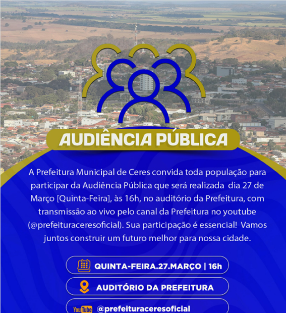 ComunicadoA Prefeitura de Ceres quer ouvir você! Participe da Audiência Pública sobre o planejamento do orçamento municipal para os próximos anos. Vamos discutir como os recursos serão aplicados para melhorar a cidade!