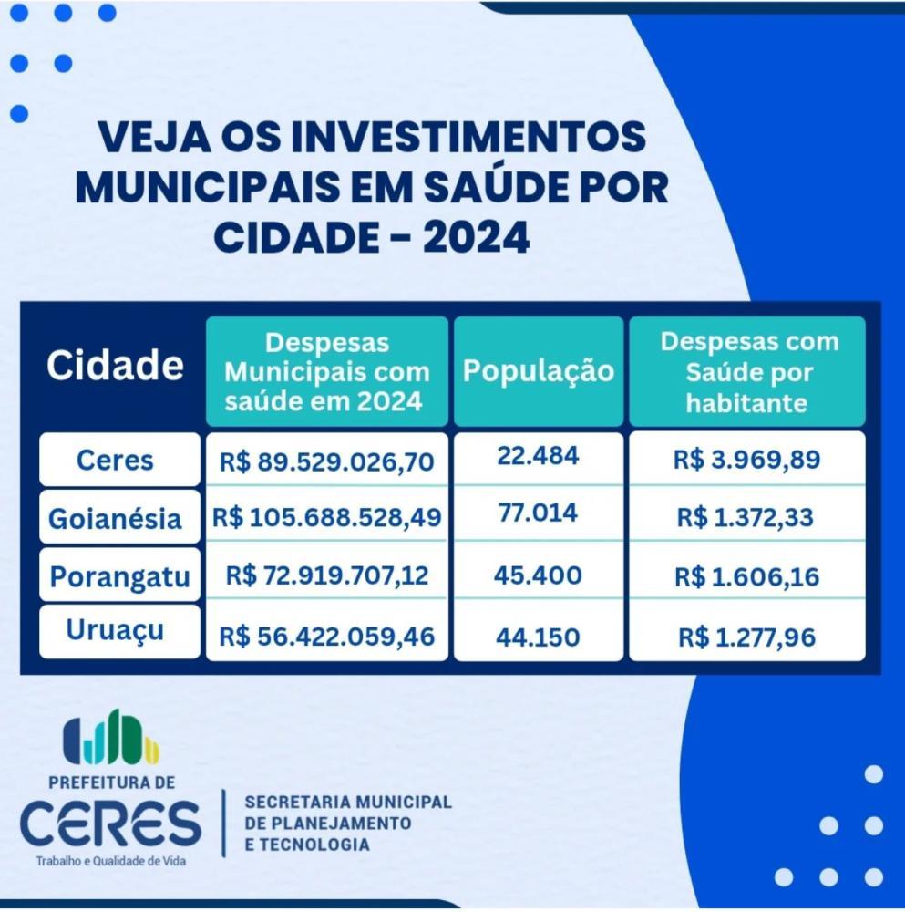 Entre as principais cidades do centro-norte goiano, Ceres se destaca pelo volume de investimentos em saúde proporcionalmente à sua população.