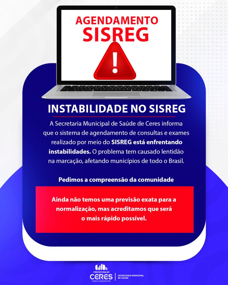 ComunicadoA Secretaria Municipal de Saúde de Ceres informa à população que o sistema de marcação de consultas e exames realizado por meio do Sistema Nacional de Regulação (Sisreg) está enfrentando instabilidades desde o início da semana. O problema, que tem causado lentidão ou até mesmo interrupções no sistema, é decorrente de falhas técnicas na base de dados localizada em Brasília.
