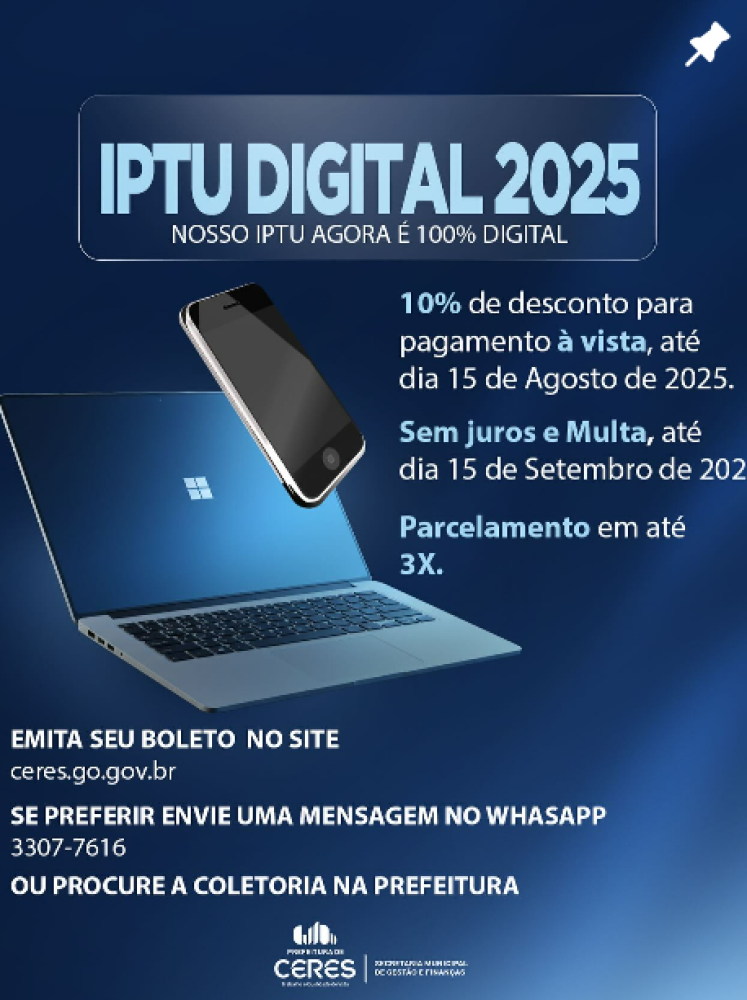 A Prefeitura de Ceres informa: o IPTU DIGITAL 2025 já está no ar!