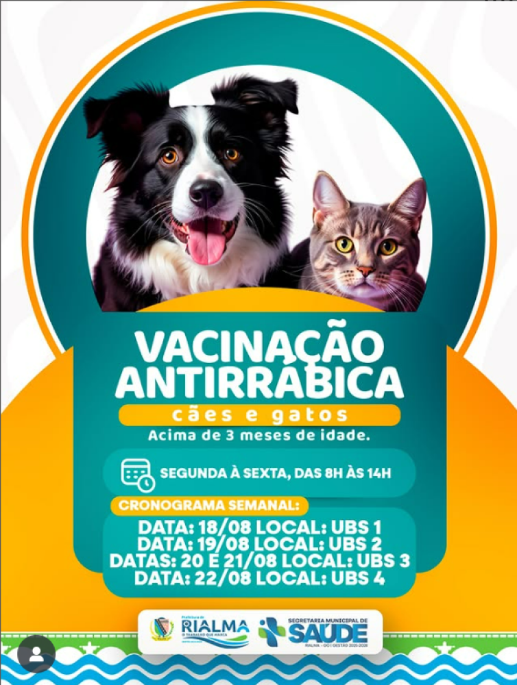 ComunicadoA Prefeitura Municipal de Rialma por meio da Secretaria Municipal de Saúde informa que a vacinação antirrábica de cães e gatos está de volta!
