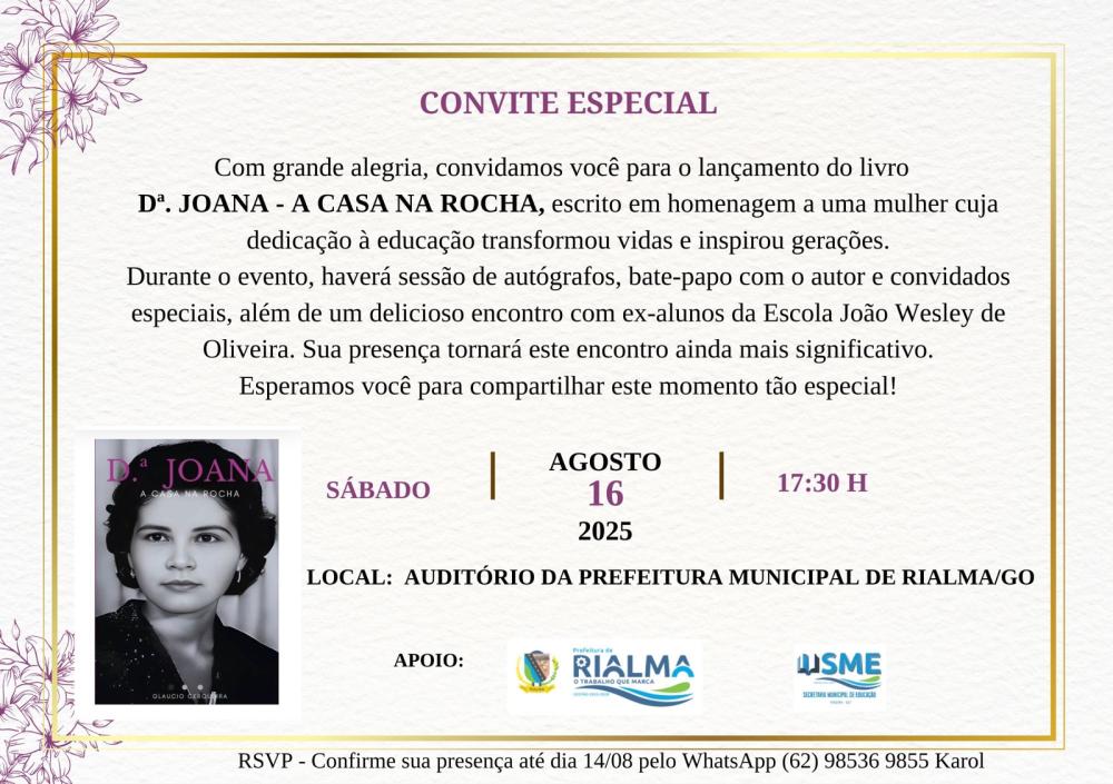 ComunicadoLançamento do livro Dª Joana, A casa na Rocha, eterniza legado da Professora e Diretora que marcou gerações na cidade de Rialma.