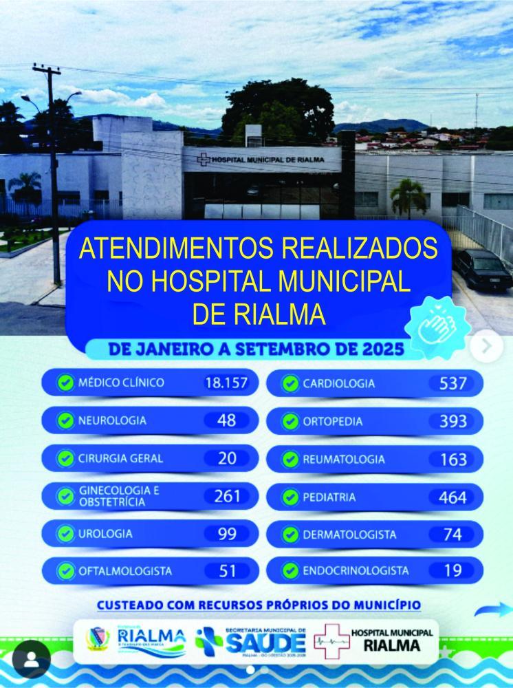 De janeiro a setembro de 2025, o Hospital Municipal de Rialma realizou milhares de atendimentos em diversas especialidades e serviços, garantindo cuidado e atenção para a população.