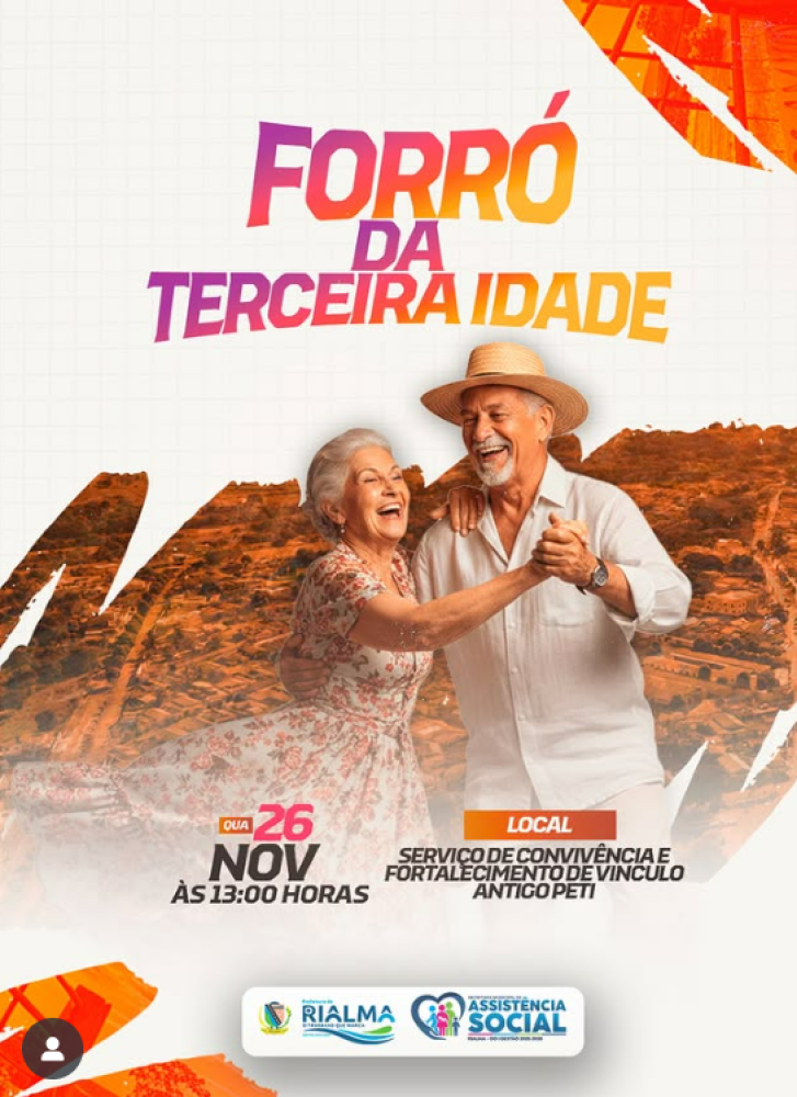 A Prefeitura Municipal de Rialma por meio da Secretaria de Assistência Social informa que no dia 26 de novembro, às 13h, acontecerá o Forró da Terceira Idade , onde vai reunir os idosos para uma tarde de dança, convivência e celebração da vida no Serviço de Convivência e Fortalecimento de Vínculos (Local: antigo PETI).
