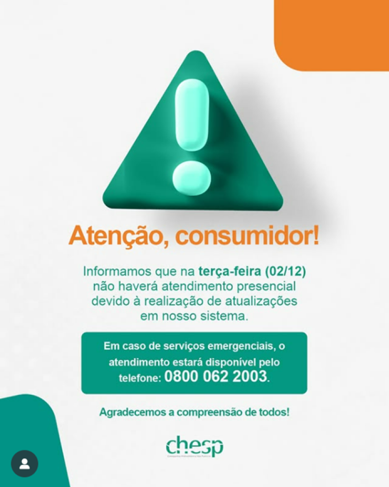 ComunicadoAtenção, consumidor CHESP: na próxima terça-feira, dia 2 de dezembro, não haverá atendimento presencial.