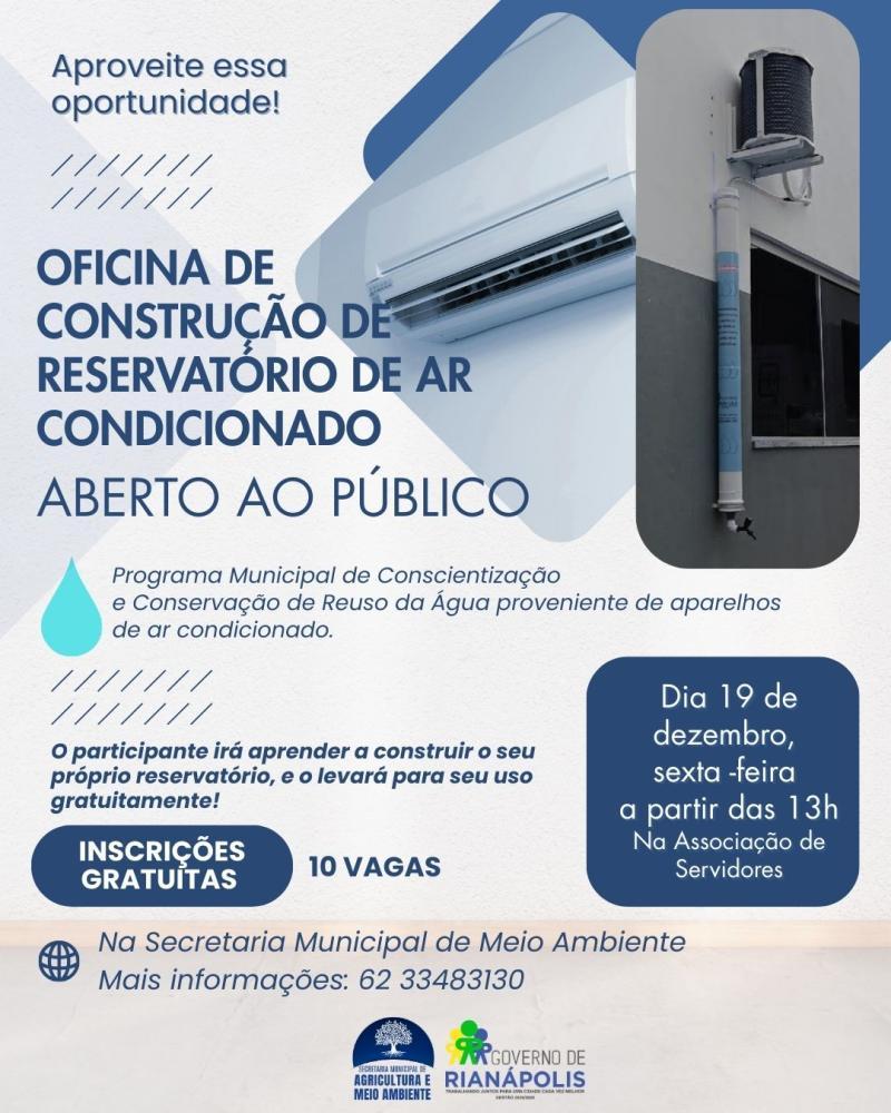 A Prefeitura de Rianápolis informa: A Secretaria Municipal de Meio Ambiente está com inscrições abertas para a Oficina de Construção de Reservatórios de Reuso da Água do Ar-Condicionado, uma ação do Programa Municipal de Conscientização e Conservação da Água.