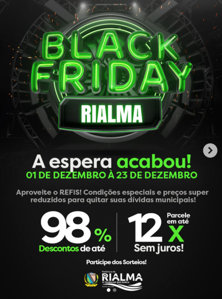 De 1º a 23 de dezembro, você pode aproveitar a Black Friday Rialma com até 98% de desconto em juros e multas pelo REFIS, além de parcelamento em até 12x sem juros para quitar dívidas municipais.