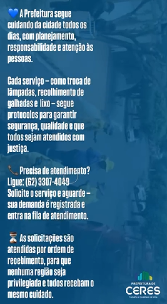 ComunicadoA Prefeitura de Ceres segue realizando diariamente serviços de manutenção urbana em toda a cidade, como troca de lâmpadas, recolhimento de galhadas e lixo, entre outras demandas, seguindo planejamento, protocolos técnicos e organização para garantir segurança, qualidade e atendimento justo à população.
