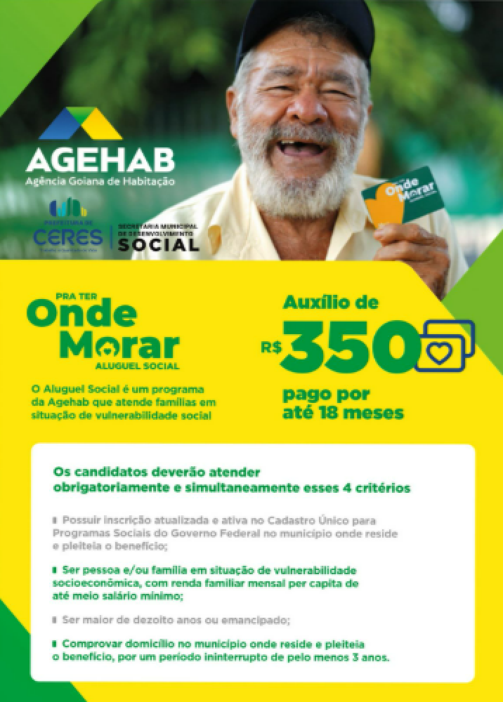 O município de Ceres foi contemplado com 96 vagas do Programa Pra Ter Onde Morar – Aluguel Social, uma iniciativa do Governo de Goiás, por meio da AGEHAB, para apoiar famílias em situação de vulnerabilidade social.