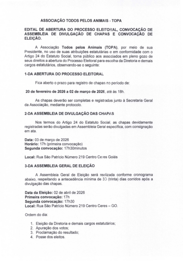 Tweet Edital de abertura do processo eleitoral, convocação de assembleia de divulgação de chapas e convocação de eleição (TOPA) Comunicado FOTOS NOTÍCIAS RELACIONADAS Palestra especial com Dra. Luciana Darrot, trazendo conhecimento e motivação para mulheres que desejam empreender, crescer e transformar suas realidades. Prefeitura de Rialma informa: Evento Mulher EmpreendedoraUm momento especial de inspiração,... Convite para a 1ª Feira do Agronegócio do Vale do São Patrício Convite para a 1ª Feira do Agronegócio do Vale do São Patrício O secretário de... Câmara Municipal de Ceres realiza a 1ª Sessão Ordinária do mês de março de 2026 Câmara Municipal de Ceres realiza a 1ª Sessão Ordinária do mês de março de... Ceres promove capacitação sobre cuidados com o pé diabético e recebe R$ 10 mil para fortalecer Atenção Básica Ceres promove capacitação sobre cuidados com o pé diabético e recebe R$ 10 mil para... Mais lidas ComunicadoComunicadoCidadaniaJustiçaEsporte Comunicado VOCÊ TEM UMA IDEIA… MAS ELA AINDA NÃO VIROU... Cidadania Semi Final da 9ª Copa Regional de Futsal de... Comunicado Rianápolis celebra o encerramento da 9ª Copa... 6º EDITAL DE CONVOCAÇÃO – PROCESSO SELETIVO... EDITAL DE CONVOCAÇÃO ConCHESP realiza a primeira reunião de 2026 e...