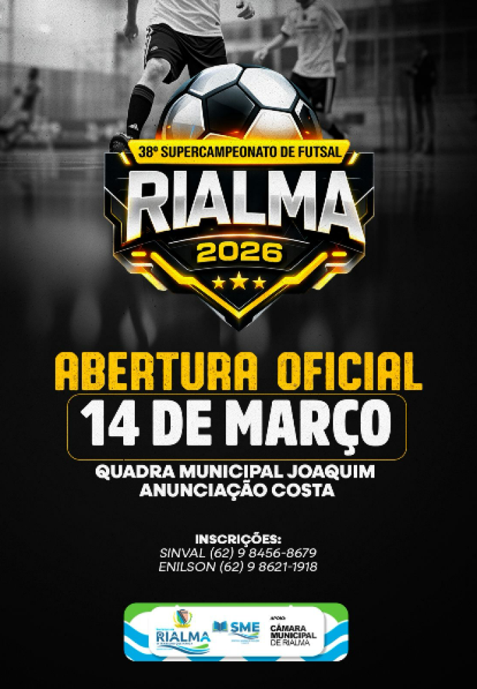 A Prefeitura de Rialma, por meio da Secretaria Municipal de Educação e com apoio da Câmara Municipal, realizará no próximo dia 14 de março a abertura oficial do 38º Supercampeonato de Futsal – Rialma 2026.