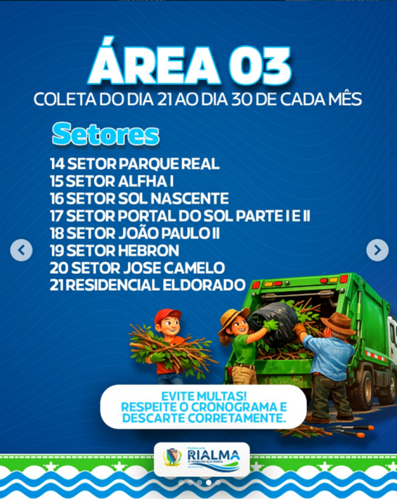 A Prefeitura de Rialma informa que a coleta de podas de galhadas, corte de mato, gramas e materiais que possam acumular água seguirá um cronograma organizado por setores em toda a cidade.