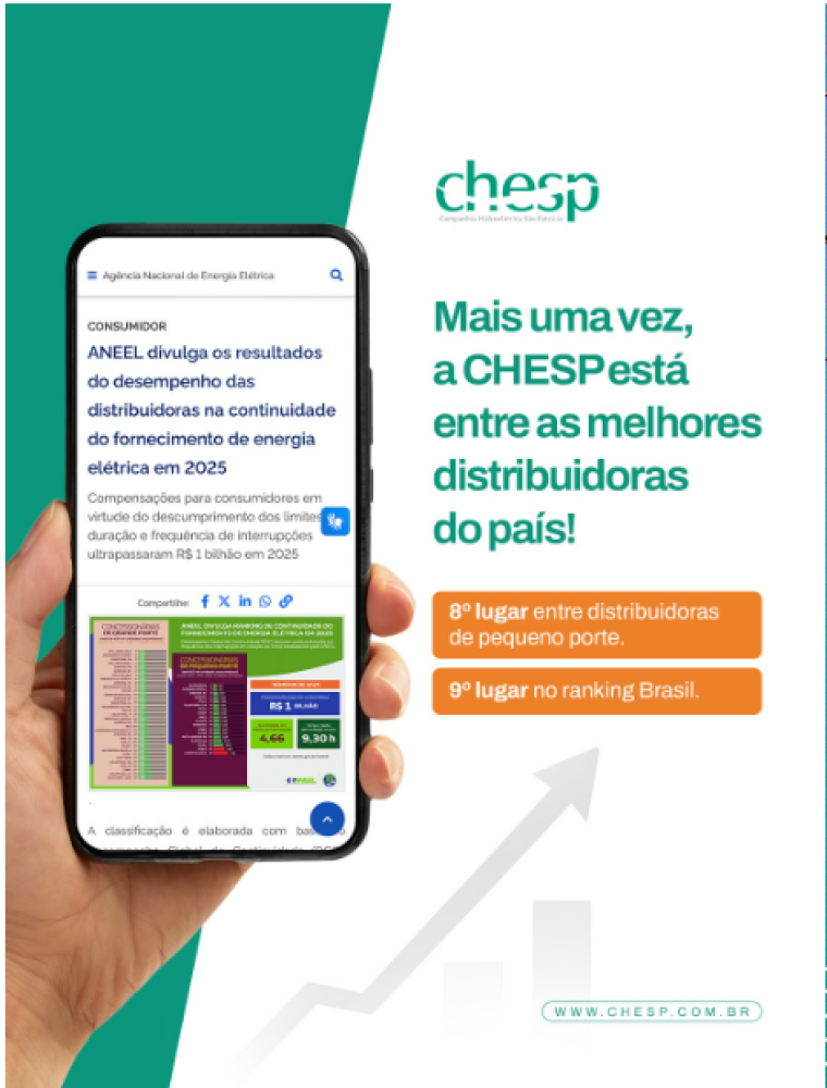 Nesta quarta-feira (25), a CHESP recebeu o Prêmio ANEEL de Satisfação do Consumidor 2025, na categoria Regiões Sul, Sudeste e Centro-Oeste, para distribuidoras de 30 mil a 500 mil unidades consumidoras.