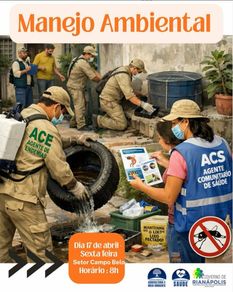 Nesta ação de manejo ambiental, nossos Agentes de Endemias e Agentes de Saúde atuam juntos na eliminação de focos do mosquito, controle de vetores e orientação à população.
